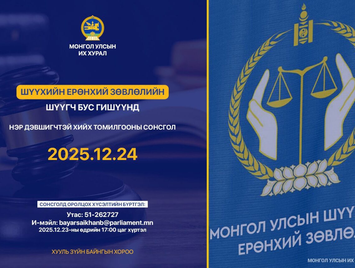 Томилгооны сонсголд оролцох хүсэлтэй иргэн, хуулийн этгээд, хэвлэл мэдээлэл, олон нийтийн байгууллагын төлөөлөл “Томилгооны сонсголд оролцогчийн бүртгэлийн хуудас”-ыг бөглөж 2025 оны 12 дугаар сарын 23-ны өдрийн 17.00 цагаас өмнө bayarsaikhanb@parliament.mn имэйл хаягаар ирүүлнэ үү.